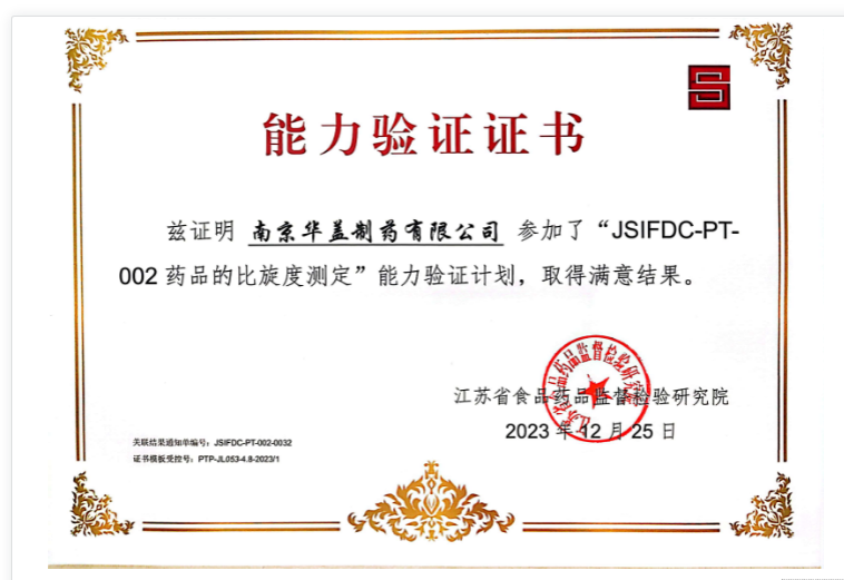 南京華蓋制藥質(zhì)量控制實(shí)驗(yàn)室參加了2023年度江蘇省食品藥品監(jiān)督檢驗(yàn)院JSIFDC-PT-001維生素C含量測(cè)定、JSIFDC-PT-002藥品的比旋度測(cè)定兩項(xiàng)能力驗(yàn)證,并于2023年12月27日收到兩份能力驗(yàn)證證書和結(jié)果通知單,兩項(xiàng)能力驗(yàn)證均取得滿意結(jié)果!
